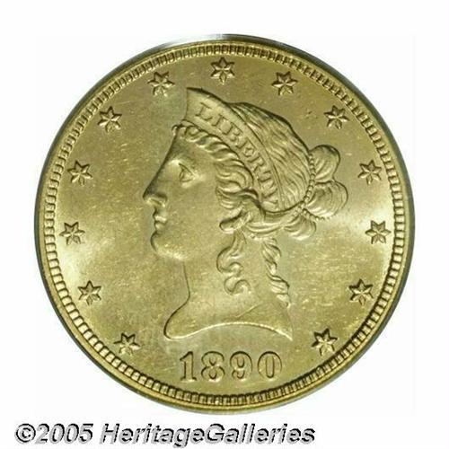 <B>1890-CC<$10> MS62 PCGS.</B></I> Brilliant and frosty. Virtually all design features are boldly and deeply defined including Liberty's hair, the obverse stars, and the eagle's claws and feathers. Very attractive for the grade. The 1890-CC is much scarcer than the 1891-CC in Uncirculated grades. Population: 22 in 62, 8 finer (4/05).