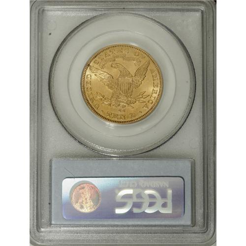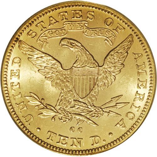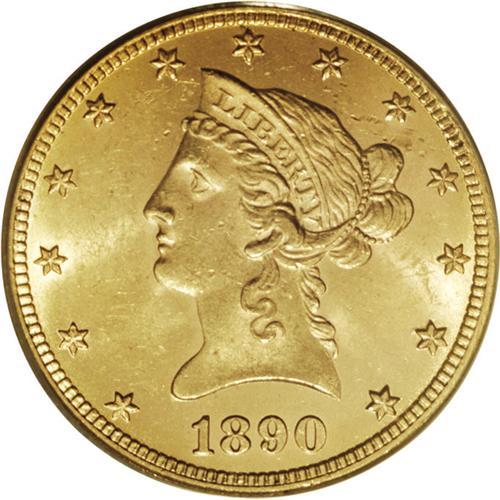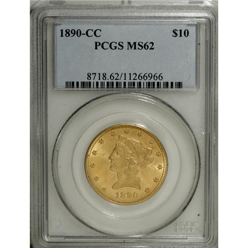 <B>1890-CC $10 MS62 PCGS.</B></I> IN GOD WE TRUST is lightly die doubled, but collectors will likely be more impressed by the comprehensive and energetic cartwheel luster. The strike is exacting, and the surfaces are surprisingly unblemished for the often notably abraded MS62 level. Far scarcer than its 1891-CC successor. Population: 27 in 62, 9 finer (1/07).<BR><BR><b>Shipping:</b> Coins & Currency (<a target="_blank" href="http://www.heritageauctions.com/common/shipping.php">view shipping information</a>)