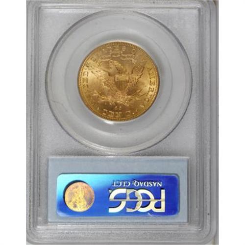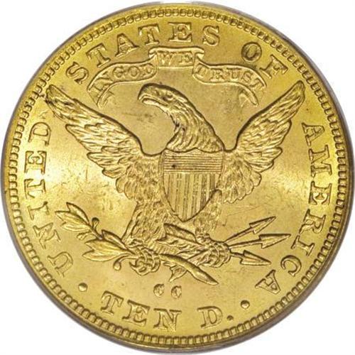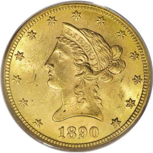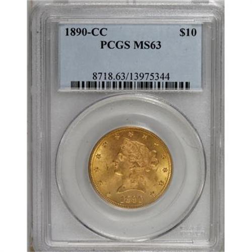 <B>1890-CC $10 MS63 PCGS.</B></I> Carson City eagles are seldom seen at the MS63 level. Even the 1891-CC, which is relatively plentiful in AU58 to MS62, is a rarity any finer. But the 1890-CC is more difficult than the 1891-CC, as expected from its tiny mintage of 17,500 pieces. With patience, examples can be located in AU and lower Mint State grades. However, the arrival of a pleasing MS63 at auction is an important opportunity for Carson City specialists. Heritage has sold only one other MS63 at auction, in our July Summer FUN Signature, which realized $17,250. The present straw-gold representative offers unbroken cartwheel sheen and is precisely struck. The only remotely reportable mark is a wispy line above the uppermost arrowhead. IN GOD WE TRUST is lightly die doubled, as always for the issue. Population: 9 in 63, 1 finer (8/07).<BR><BR><B>Coin Engraver:</B> Christian Gobrecht<BR><BR><b>Shipping:</b> Coins & Currency (<a target="_blank" href="http://www.heritageauctions.com/common/shipping.php">view shipping information</a>)