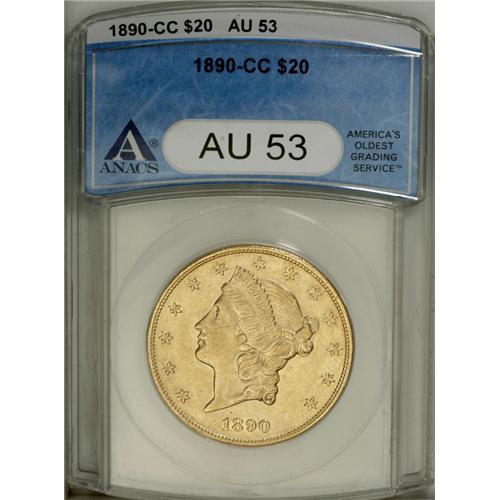 <B>1890-CC $20 AU53 ANACS.</B></I> A partly lustrous and evenly struck Carson City twenty. Pleasing despite a thin mark on the cheekbone. A prominent lintmark travels from 9:30 to 10:30 across the reverse border, and is sufficiently interesting to raise the value. The lower left reverse is lightly die doubled, as usually seen.<BR><BR><b>Shipping:</b> Coin/Currency (<a target="_blank" href="http://www.heritageauctions.com/common/shipping.php">view shipping information</a>)