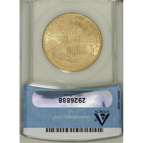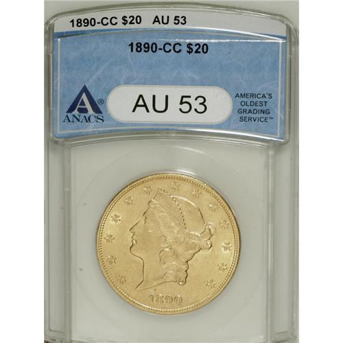 <B>1890-CC $20 AU53 ANACS.</B></I> Luminous with even definition throughout. An abrasion appears at the upper cheekbone, though the apparent mark that appears at the upper left reverse is actually a strike-through. This green-tinged piece represents a great opportunity to own affordable Carson City gold.<BR><BR><b>Shipping:</b> Coins & Currency (<a target="_blank" href="http://www.heritageauctions.com/common/shipping.php">view shipping information</a>)