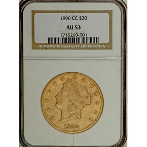 <B>1890-CC $20 AU53 NGC.</B></I> Some luster is still seen in the protected areas and the surfaces are shaded a pleasing rose-gold color. A popular and affordable Carson City double eagle with a relatively low mintage of 91,209.<BR><BR><B>Coin Engraver:</B> James B. Longacre<BR><BR><b>Shipping:</b> Coins & Currency (<a target="_blank" href="http://www.heritageauctions.com/common/shipping.php">view shipping information</a>)