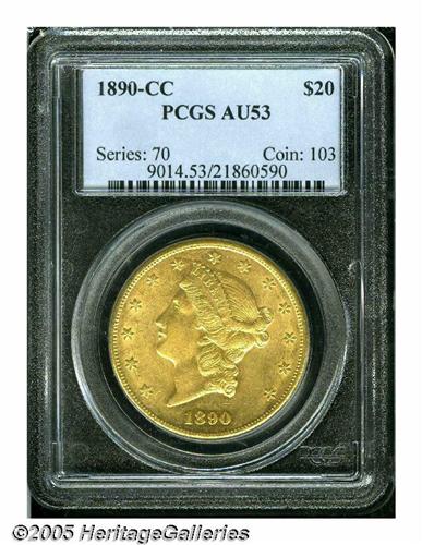 <B>1890-CC<$20> AU53 PCGS.</B></I> Nice luster is retained in the areas around the design elements on this apricot-gold CC double eagle. The motifs reveal sharp definition throughout, and just a few minute marks are scattered about. This example possesses nice overall eye appeal.