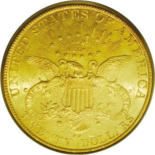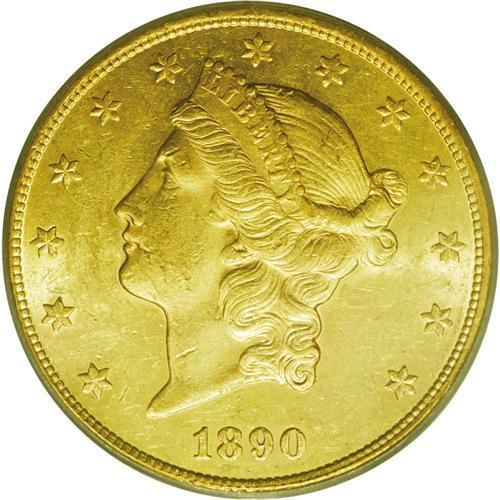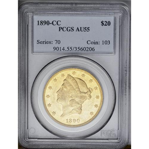 <B>1890-CC<$20> AU55 PCGS.</B></I> Luster forms a broad band across each individual obverse star, and reverse luster is nearly complete. Lemon-gold patina helps confirm the originality. Smooth for a lightly circulated double eagle, except for a few scuffs on the cheek. PLURIBUS and TWENTY are nicely die doubled, as usually seen on this later CC-mint issue.<BR><I>From The Guadalupe Collection, Part Two.</B></I>