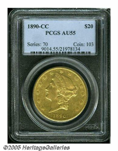 <B>1890-CC<$20> AU55 PCGS.</B></I> Nearly fully lustrous with soft, frosty surfaces and pleasing light yellow color. Traces of wear are only visible on the high points.
