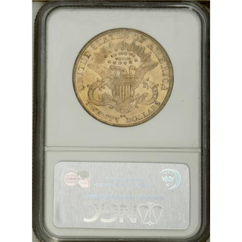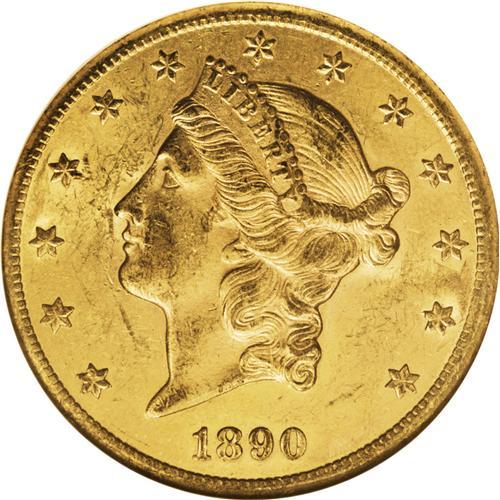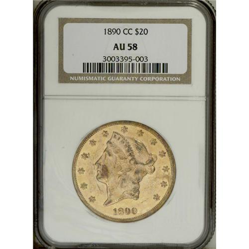<B>1890-CC $20 AU58 NGC.</B></I> A lustrous apricot-gold Carson City twenty that would readily fit within an otherwise Mint State holding. Friction on the cheek is all that prevents an Uncirculated assessment. The reverse is particularly unmarked for the grade. From the usual reverse die with minor doubling on PLURIBUS and TWENTY.<BR><BR><b>Shipping:</b> Coin/Currency (<a target="_blank" href="http://www.heritageauctions.com/common/shipping.php">view shipping information</a>)