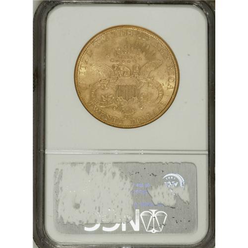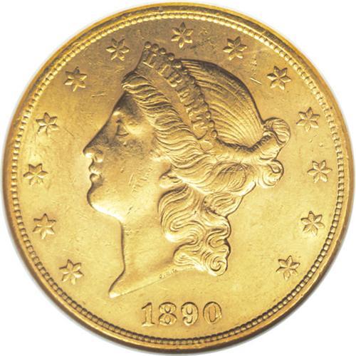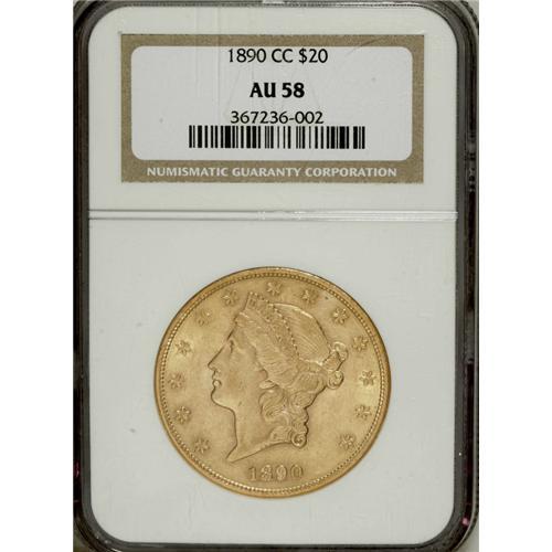 <B>1890-CC $20 AU58 NGC.</B></I> Increased gold deposits led to greater outputs at the Carson City Mint in 1890, resulting in a relatively high mintage of more than 90,000 double eagles. The yellow-orange surfaces on this piece are still quite lustrous, and the light abrasions noted on the surfaces are more indicative of bag storage than of extensive circulation. A well struck and attractive piece.<BR><BR><b>Shipping:</b> Coins & Currency (<a target="_blank" href="http://www.heritageauctions.com/common/shipping.php">view shipping information</a>)