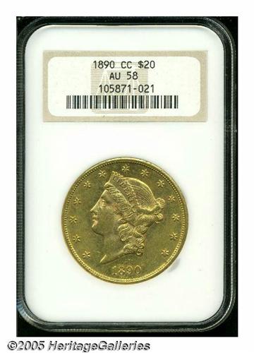 <B>1890-CC<$20> AU58 NGC.</B></I> This CC issue displays bright peach-gold patina with ample remaining luster. The fields are somewhat prooflike, especially on the obverse, and offer a nice contrast with the motifs. The design elements are nicely defined, and a few minute abrasions are visible on Liberty's cheek.
