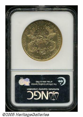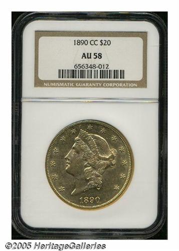 <B>1890-CC<$20> AU58 NGC.</B></I> This lustrous and sharply struck slider has no obtrusive marks. Faint wear on the hair on the eagle's wings prevents a Mint State designation. The reverse is lightly die doubled, most noticeable on PLURIBUS, TWENTY, and UNITED STATES.