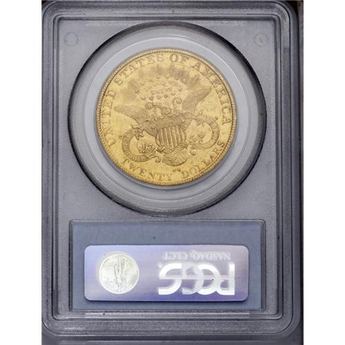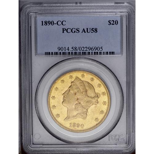 <B>1890-CC $20 AU58 PCGS.</B></I> Faint friction on the cheek precludes a Mint State designation, but luster is pervasive throughout the fields. A honey-gold Carson City piece without mentionable marks. As is the case for most 1890-CC Double Eagles, light die doubling is seen on PLURIBUS and TWENTY.
