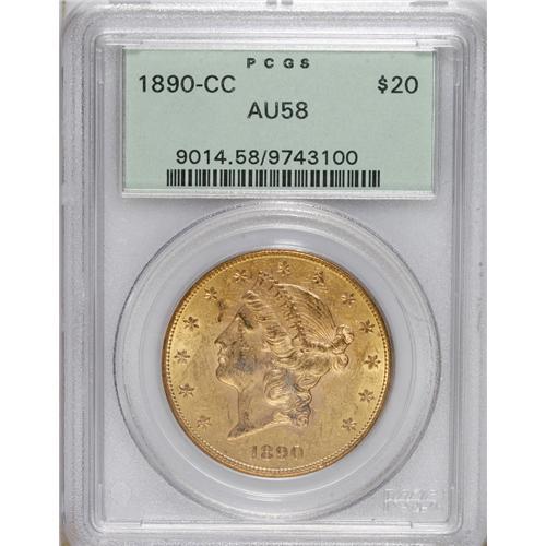 <B>1890-CC $20 AU58 PCGS.</B></I> Close to Mint State, but the portrait and the eagle's left (facing) wing exhibit some struck-in grease. The lower left reverse is die doubled, as frequently seen on this popular CC-mint date. Encased in a green label holder.<BR><BR><b>Shipping:</b> Coins & Currency (<a target="_blank" href="http://www.heritageauctions.com/common/shipping.php">view shipping information</a>)