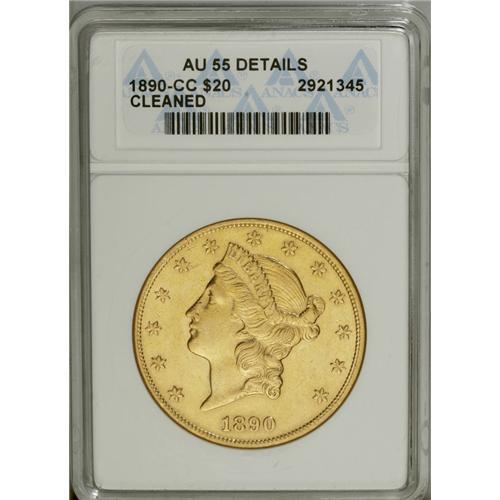 <B>1890-CC $20 --Cleaned--ANACS. AU55 Details.</B></I> A hint of peripheral luster remains on the slick honey-orange surfaces. Liberty's features are bold despite light highpoint wear.<BR><BR><b>Shipping:</b> Coin/Currency (<a target="_blank" href="http://www.heritageauctions.com/common/shipping.php">view shipping information</a>)