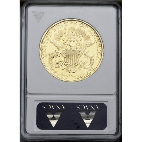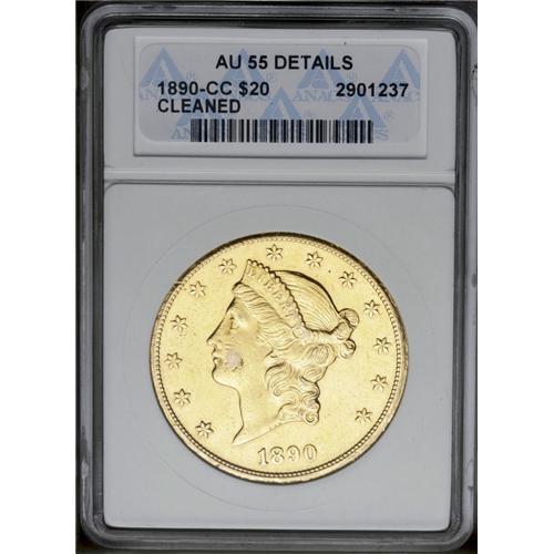<B>1890-CC<$20>--Cleaned--ANACS. AU55 Details.</B></I> Uniformly lustrous with hairlined surfaces. Gray-lilac appears on the cheek of this otherwise yellow-gold piece, lightly worn and cleaned, yet important as a Carson City Mint product.