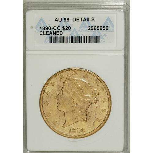 <B>1890-CC $20 --Cleaned--ANACS. AU58 Details.</B></I> Well-defined in the centers, though the peripheral elements are soft. Modestly marked with just a touch of highpoint friction, though the strongly lustrous fields are slightly muted due to cleaning. An interesting example from the waning years of the Carson City Mint.<BR><BR><b>Shipping:</b> Coins & Currency (<a target="_blank" href="http://www.heritageauctions.com/common/shipping.php">view shipping information</a>)