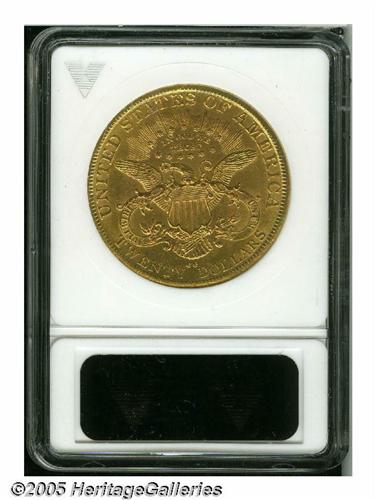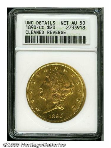 <B>1890-CC<$20>--Cleaned Reverse--ANACS. Unc Details, Net AU50.</B></I> The reverse is lightly die doubled, most noticeable on PLURIBUS and UNITED STATES. Unmentioned in the Bowers or Winter references of recent years. Wispy horizontal hairlines cross the reverse, but this boldly struck Carson City piece exhibits extensive cartwheel luster. Minor pitting affects the A in STATES.