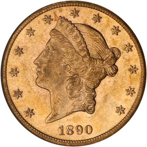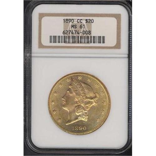 <b>1890-CC $20 Liberty. NGC graded MS61.</b> 91,209 minted. A satiny frosted to semi-prooflike specimen. Supple underlying luster is enveloped in pale pinkish toning iridescence. Meanwhile, the absence of extensive bagmarks makes for a pleasing example of the date, not completely bagmark free (there is a small chatter on the lower neck), but with sufficient smoothness in the portrait and field area (including the field of the reverse) that collectors will be pleased with the result <b>(PCGS # 9014)</b> <i>