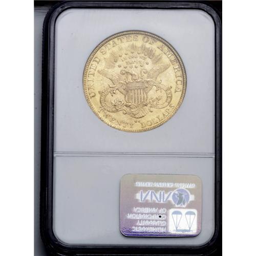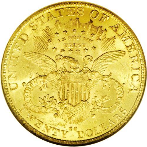 <B>1890-CC<$20> MS60 NGC.</B></I> An attentively struck and lustrous representative. The obverse is expectantly abraded for the grade, while the reverse is relatively clean. Although the 1890-CC is generally available, most survivors are in XF to AU grades. Like many 1890-CC double eagles, the reverse is die doubled, particularly on the tops of TWENTY.