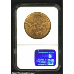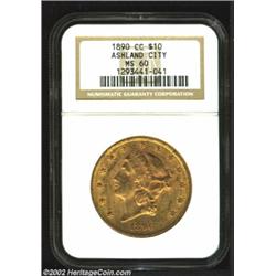 1890-CC $20 MS60 NGC. Winter 1-A, the only known dies. The orange-gold surfaces display an original look with appreciably bold striking detail. Both sides are a little bit hazy with a smattering of abrasions that account for the MS60 designation. There are a few moderate cuts at the top of Liberty's head. The 1890-CC (91,209 pieces produced) is a popular issue among CC-mint type collectors, although with only 200 pieces believed extant in Mint State, it is more difficult to locate at that level than the 1875-CC.From the Ashland City Collection. Important notice: We expect to be auctioning lots at the rate of 200-250 per hour. Sometimes eBay Premier live bid software cannot keep up with that pace, so we strongly recommend that you place a realistic proxy bid now as insurance to avoid disappointment. Also please note that all Heritage/CAA lots purchased through eBay Premier carry a 20% Buyer's Premium. Please make sure you read the Terms and Conditions.