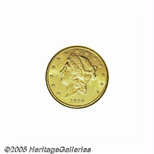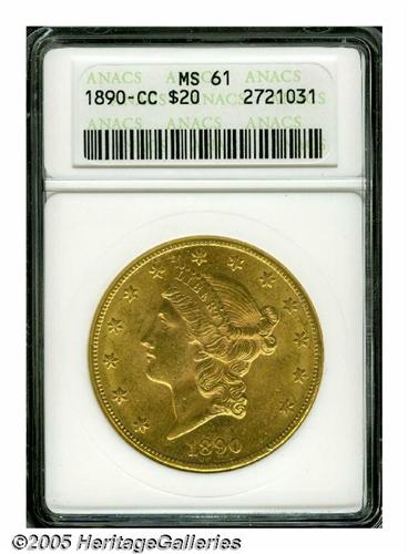 <B>1890-CC<$20> MS61 ANACS.</B></I> Fully lustrous with pleasing color and well scattered field marks. A number of pinpoint-sized planchet flaws (as struck) are evident in the reverse fields. Found without too much difficulty in AU condition, but strict Mint State pieces, particularly nicer ones, are scarce.
