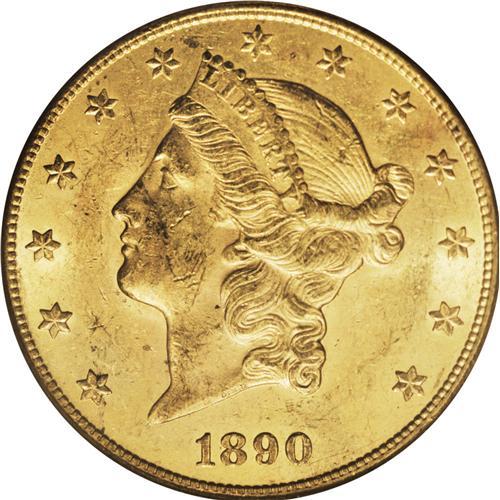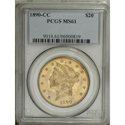 <B>1890-CC $20 MS61 PCGS.</B></I> The yellow-orange surfaces have hints of peach and emerald-green in the lustrous fields. Solidly struck devices enhance the eye appeal, though scattered marks and several light abrasions affect each side. Several copper spots also appear on the obverse. Though this issue is perhaps the most available Carson City double eagle in Mint State, any such example is still highly prized. PLURIBUS and TWENTY are lightly die doubled.<BR><BR><b>Shipping:</b> Coin/Currency (<a target="_blank" href="http://www.heritageauctions.com/common/shipping.php">view shipping information</a>)