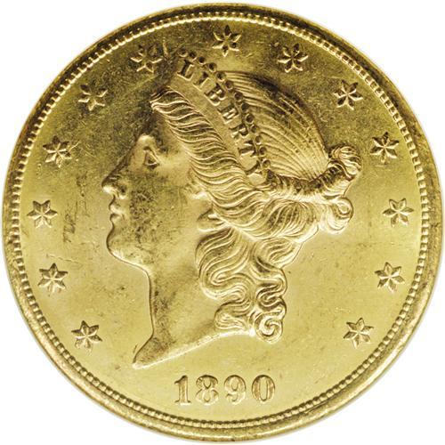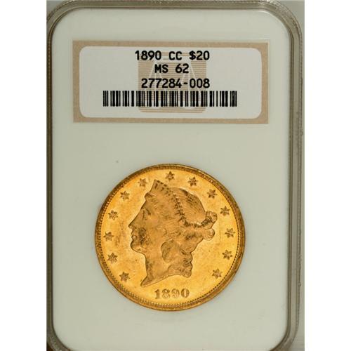 <B>1890-CC $20 MS62 NGC.</B></I> Several examples of this scarce issue are offered in the present sale, including this lovely Mint State example that is approaching the finest available quality for the date. Both sides are exceptionally well detailed and the surfaces are minimally abraded as expected for the grade. The fields of both obverse and reverse are highly reflective , and IN GOD WE TRUST is lightly die-doubled. The central devices of the eagle and shield exhibit gun-metal blue toning. Census: 21 in 62, 0 finer (12/06).<BR><BR><b>Shipping:</b> Coin/Currency (<a target="_blank" href="http://www.heritageauctions.com/common/shipping.php">view shipping information</a>)