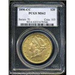 1890-CC $20 MS62 PCGS. As the most available "CC" <B>1890-CC $20 MS62 PCGS.</B></I> As the most available "CC" Double Eagle, the 1890 has heavy demand placed on it for type purposes. However, the vast majority of coins available are in the XF-MS61 grade range. Coins that grade MS62 are seldom encountered and only a couple of MS63 pieces have been certified. This is a very attractive pinkish tinted coin that has excellent mint luster and minimal abrasions for an MS62. Sharply struck throughout. Population: 18 in 62, 2 finer (10/04). <BR><BR><B>Important notice:</B> Heritage usually auctions material at the rate of 200-250 lots per hour. On some occasions eBay Live bid software or the Internet may not be able to keep up with the pace of the auction. We recommend placing a realistic absentee bid now as insurance to avoid disappointment. Occasionally the auctioneer may eliminate or reject an eBay Live bid, and the auctioneer may also reopen a lot after the close of the eBay live bidding (usually because we missed an audience bid), and may reject your bid even if it shows you as the winning bidder. By bidding via eBay Live, you agree that Heritage may award the lot to another bidder at its sole discretion under the circumstances described above or any other reasonable circumstances. Since eBay bids are not shown to us until we open the lot on the floor, we treat those bids just like floor bids. In most cases the floor responds before the eBay bid is presented to us, due to Internet lag time, so for consistency we have made it a policy that floor bids are always considered first over tie eBay live bids. Also please note that all Heritage lots purchased through eBay Live carry a 20% Buyer's Premium. Please make sure you read the Terms and Conditions before you bid. This lot is being auctioned in conjunction with a live floor auction by Heritage Galleries & Auctioneers. All final auction and invoice information will be supplied by Heritage Galleries & Auctioneers, and all other information should be considered preliminary. Lot:6935