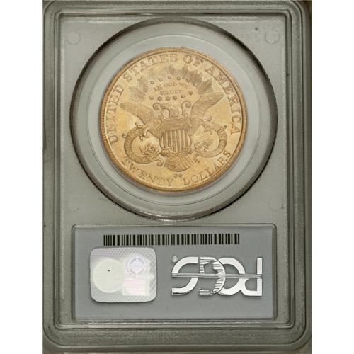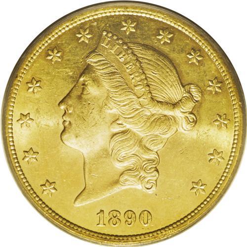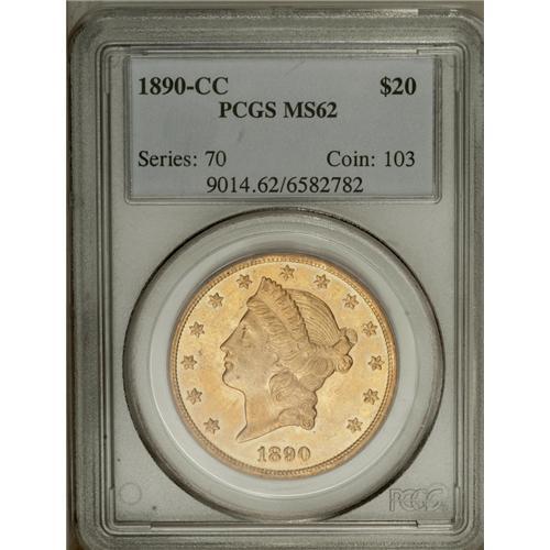 <B>1890-CC<$20> MS62 PCGS.</B></I> Several examples of this scarce issue are offered in the present sale, including this lovely Mint State example that is approaching the finest available quality for the date. Both sides are exceptionally well detailed and the surfaces are minimally abraded as expected for the grade. This example is highly appealing with rich green-gold color, faint rose-pink overtones, and reflective surfaces. Like most double eagles of this date, PLURIBUS and TWENTY are clearly doubled. Population: 38 in 62, 7 finer (7/06).