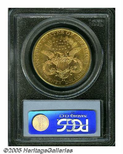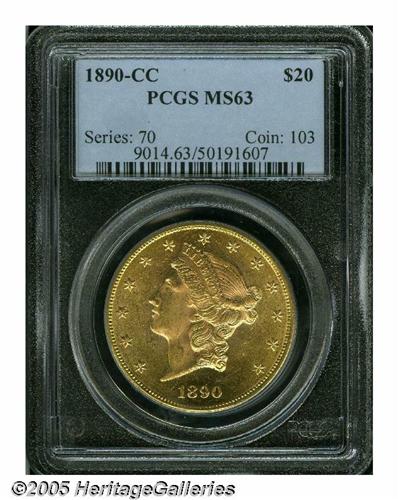 <B>1890-CC<$20> MS63 PCGS.</B></I> The 1890-CC is the most available Carson City double eagle. It is generally available in XF and on up into to the lower grades of Mint State. However, any coin that grades MS62 qualifies as a Condition Census coin. Only two other MS63s have been certified by PCGS (none by NGC) with none finer at either of the major services. This particular coin combines the popularity of a type coin with finest known status to produce a double eagle of irresistible charm and desirability. The fields are bright and semi-reflective, a quality that greatly enhances the overall eye appeal. Sharply struck, except on the peripheral obverse stars, there are a few small marks scattered about with a small alloy spot in the field just below Liberty's chin. An outstanding 1890-CC double eagle and a coin that is sure to set a new record for this issue.