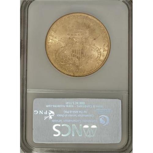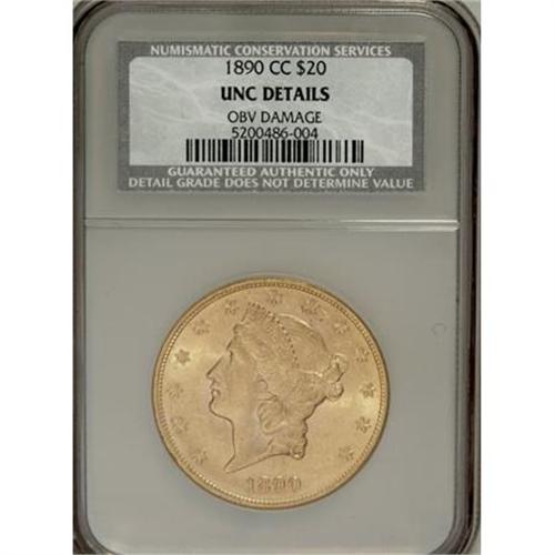<B>1890-CC $20 --Obverse Damage--NCS. Unc. Details.</B></I> This lustrous double eagle appears at first glance to grade MS62 or MS63, but a relatively deep mark is present on the left border of the cheek. PLURIBUS and TWENTY are minutely die doubled, as usual for this popular Carson City issue.<BR><BR><B>Coin Engraver:</B> James B. Longacre<BR><BR><b>Shipping:</b> Coins & Currency (<a target="_blank" href="http://www.heritageauctions.com/common/shipping.php">view shipping information</a>)
