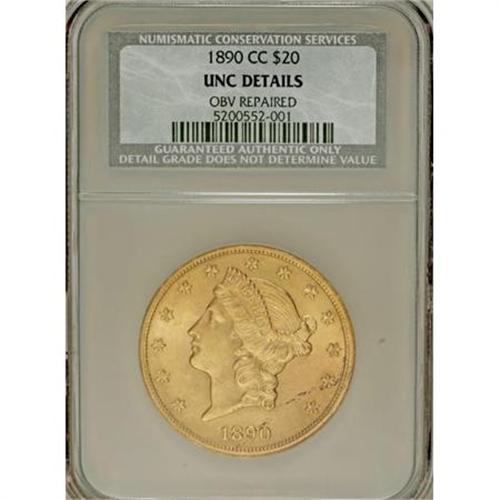 <B>1890-CC $20 --Obverse Repaired--NCS. Unc. Details.</B></I> The lower right obverse field has been smoothed, visible to the unaided eye only as a break in luster and a slight change in color and elevation. The usual reverse die with minor die doubling on several legends.<BR><BR><B>Coin Engraver:</B> James B. Longacre<BR><BR><b>Shipping:</b> Coins & Currency (<a target="_blank" href="http://www.heritageauctions.com/common/shipping.php">view shipping information</a>)