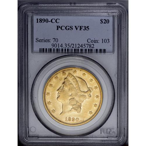 <B>1890-CC<$20> VF35 PCGS.</B></I> Bright apricot-gold surfaces yield traces of luster in some of the recesses, and light abrasions are evenly distributed over both sides. The design elements retain excellent definition.<BR><I>From The Steve Glenn Collection.</B></I> <BR><BR><B>Important notice:</B> Heritage usually auctions material at the rate of 200-250 lots per hour. On some occasions eBay Live bid software or the Internet may not be able to keep up with the pace of the auction. We recommend placing a realistic absentee bid now as insurance to avoid disappointment. Occasionally the auctioneer may eliminate or reject an eBay Live bid, and the auctioneer may also reopen a lot after the close of the eBay live bidding (usually because we missed an audience bid), and may reject your bid even if it shows you as the winning bidder. By bidding via eBay Live, you agree that Heritage may award the lot to another bidder at its sole discretion under the circumstances described above or any other reasonable circumstances. Since eBay bids are not shown to us until we open the lot on the floor, we treat those bids just like floor bids. In most cases the floor responds before the eBay bid is presented to us, due to Internet lag time, so for consistency we have made it a policy that floor bids are always considered first over tie eBay live bids. Also please note that all Heritage lots purchased through eBay Live carry a 20% Buyer's Premium. Please make sure you read the Terms and Conditions before you bid. This lot is being auctioned in conjunction with a live floor auction by Heritage Galleries & Auctioneers. All final auction and invoice information will be supplied by Heritage Galleries & Auctioneers, and all other information should be considered preliminary. Lot:4323 <BR><BR><B>Winning Notification and Billing:</B> After the FINAL session in this auction is complete, Heritage will send e-mail and snail mail invoices. This process normally takes several days. All final auction and invoice information will be supplied by Heritage Galleries & Auctioneers, and all other information should be considered preliminary. <BR><BR>This auction will be conducted on a live auction floor and over the Internet through eBay Live. If you choose to place an absentee bid, please take a moment to <font color='#0000ff'><u><a href='http://pages.ebay.com/liveauctions/help/before/laabsentee.html'>learn how eBay Live absentee bidding works</a></u></font><font color='#000000'>