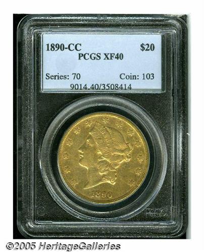 <B>1890-CC<$20> XF40 PCGS.</B></I> Lightly worn as expected for the grade, yet with pleasing surfaces and yellowish-orange color. A desirable example from the Carson City Mint.