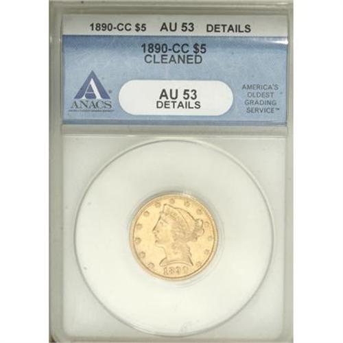 <B>1890-CC $5 --Cleaned--ANACS. AU53 Details.</B></I> NGC Census: (17/387). PCGS Population (28/269). Mintage: 53,800. Numismedia Wsl. Price for NGC/PCGS coin in AU53: $510. (#8376)<BR><BR><B>Coin Engraver:</B> Christian Gobrecht<BR><BR><b>Shipping:</b> Coins & Currency (<a target="_blank" href="http://www.heritageauctions.com/common/shipping.php">view shipping information</a>)