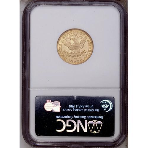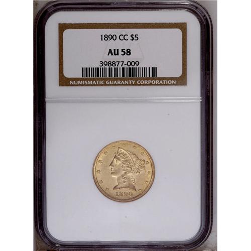 <B>1890-CC $5 AU58 NGC.</B></I> A band of bright luster dominates the peripheries of this honey-gold near-Mint Carson City Five. Marks are trivial given the grade, and the strike is only moderately soft on the eagle's neck. A miniscule speck or two of PVC is seen near the base of the 1 in the date.
