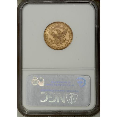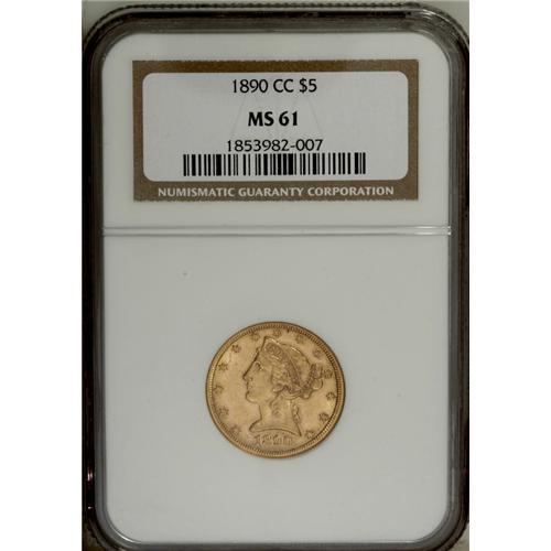 <B>1890-CC $5 MS61 NGC.</B></I> This Carson City representative displays a well-executed strike that complements attractive peach-gold luster. A higher grade would ensue were it not for the obverse bag marks. Still, a great coin for the designated grade.<BR><BR><b>Shipping:</b> Coins & Currency (<a target="_blank" href="http://www.heritageauctions.com/common/shipping.php">view shipping information</a>)