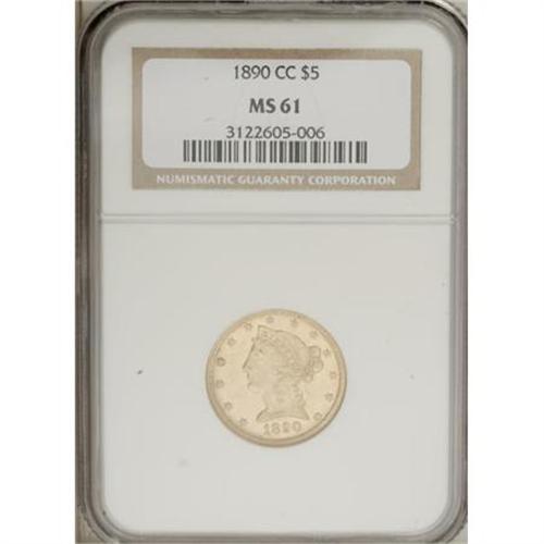 <B>1890-CC $5 MS61 NGC.</B></I> The 1890-CC half eagle had a mintage of 53,800 pieces, and is a relatively available issue for the Carson City type collector. This Mint State piece is well struck, with semi-reflective fields and appealing champagne-gold and khaki coloration. Scattered small milling marks and a few wispy hairlines restrict the grade. <BR><I>Ex: Stack's (1/91), lot 1415. </B></I><BR><I>From The John Stimson, Sr. Collection, Part Two.</B></I><BR><BR><B>Coin Engraver:</B> Christian Gobrecht<BR><BR><b>Shipping:</b> Coins & Currency (<a target="_blank" href="http://www.heritageauctions.com/common/shipping.php">view shipping information</a>)