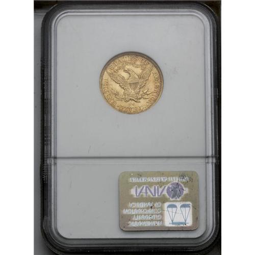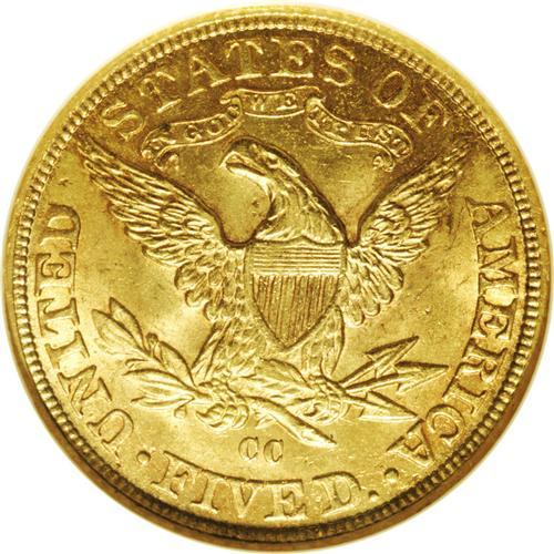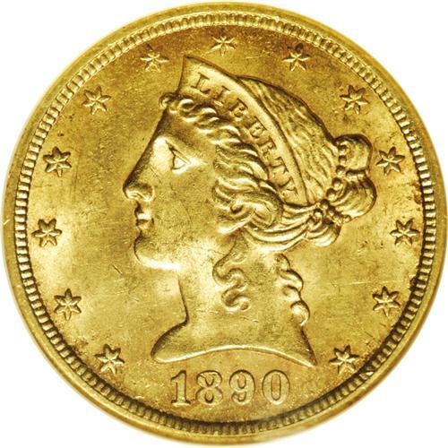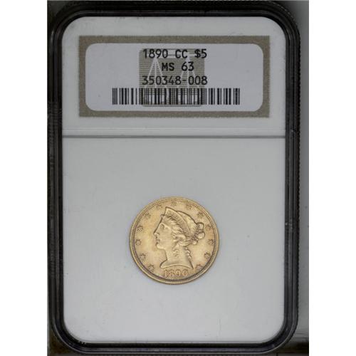 <B>1890-CC $5 MS63 NGC.</B></I> Satiny with natural golden and crimson color over sharply struck surfaces. A shallow hairline scratch is scarcely visible across the portrait from the chin to the lower curl. This more obtainable Carson City five becomes a challenging issue in better Mint State grades. Census: 36 in 63, 21 finer (1/06).