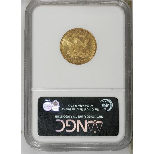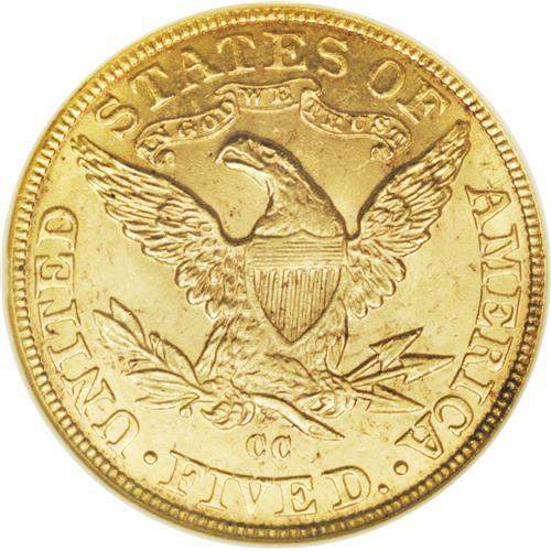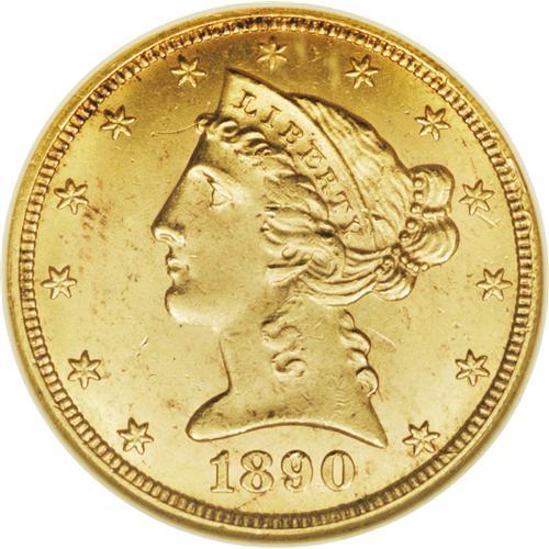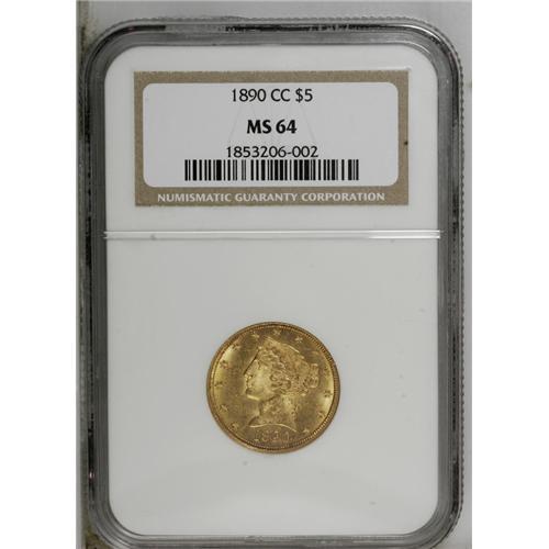 <B>1890-CC $5 MS64 NGC.</B></I> The 1890-CC is decidedly more difficult to locate in Mint State than its 1891-CC predecessor. Since the issue is nearly unobtainable in Gem, even advanced Carson City specialists often choose an MS64 example. This flashy and reasonably struck near-Gem lacks relevant marks, although a small mint-made strike-through is concealed behind the neck. Census: 25 in 64, 2 finer (10/06).<BR><BR><b>Shipping:</b> Coin/Currency (<a target="_blank" href="http://www.heritageauctions.com/common/shipping.php">view shipping information</a>)
