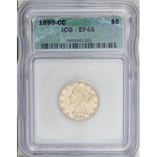 <B>1890-CC $5 XF45 ICG.</B></I> NGC Census: (22/414). PCGS Population (25/319). Mintage: 53,800. Numismedia Wsl. Price for NGC/PCGS coin in XF45: $418. (#8376)<BR><BR><B>Coin Engraver:</B> Christian Gobrecht<BR><BR><b>Shipping:</b> Coins & Currency (<a target="_blank" href="http://www.heritageauctions.com/common/shipping.php">view shipping information</a>\)
