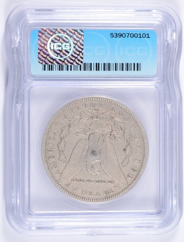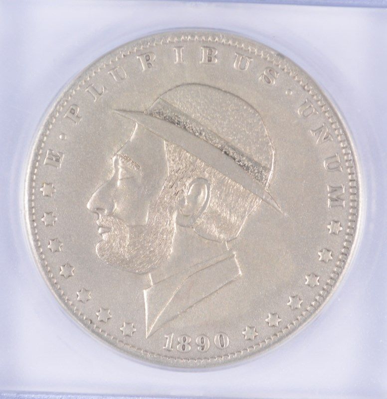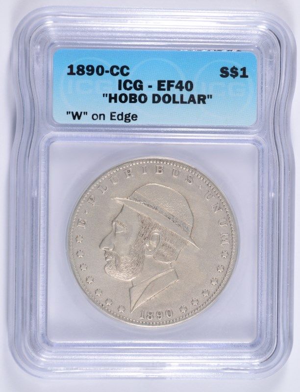 1890-CC HOBO DOLLAR "W" ON EDGE, ICG EF-40, RARE HOBO CARVING ON A CC DOLLAR