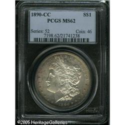 <B>1890-CC<img border='0' src='http://www.heritagecoins.com/images/star.gif' width=10 height=10>$1 MS62 PCGS.</B></I> A whisper of faint purple color gravitates to the rims. Several small contact marks are seen on Liberty's cheek. Lot:10320