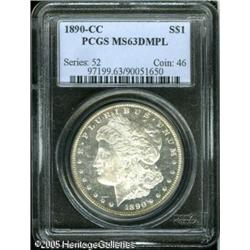 <B>1890-CC<img border='0' src='http://www.heritagecoins.com/images/star.gif' width=10 height=10>$1 MS63 Deep Mirror Prooflike PCGS.</B></I> Glimpses of golden-brown color enrich the margins of this crisply struck and inordinately mirrored better date Silver Dollar. The reverse is undisturbed, the obverse is moderately (but not unduly) marked. Lot:10331