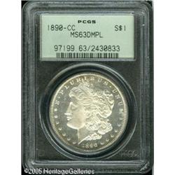 <B>1890-CC<img border='0' src='http://www.heritagecoins.com/images/star.gif' width=10 height=10>$1 MS63 Deep Mirror Prooflike PCGS.</B></I> Hints of gold color endow this deeply mirrored and meticulously struck green holder example. Scarce with such depth of reflectivity in the fields. Lot:10332