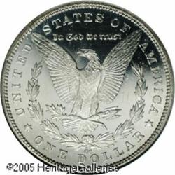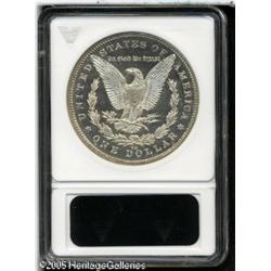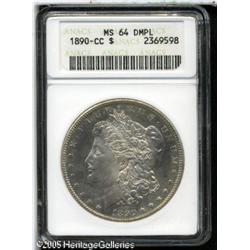 <B>1890-CC<img border='0' src='http://www.heritagecoins.com/images/star.gif' width=10 height=10>$1 MS64 Deep Mirror Prooflike ANACS.</B></I> VAM-3. Doubled 90. With literally thousands of different Morgan dollar varieties, a project like <I>The Top 100</B></I> is difficult and highly subjective. Making a determination of which dollars qualify for the top 100 varieties, and which others don't qualify, is certainly open to differing opinions. While several doubled date varieties were included among the 100 top varieties, others were not. This variety has the digits 90 sharply doubled below, and with really good eyes, this doubling can be seen without a magnifier, although a 5x or 10x magnifier allows easier appreciation.<BR> This is an extremely deeply mirrored prooflike example, with exceptional depth on both sides. The obverse has a satiny form of luster on Liberty, while the eagle on the reverse has more frosty luster. Traces of toning are present on both sides. This is a gorgeous example and is highly desirable. Lot:10333