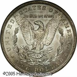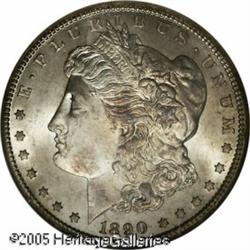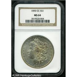 <B>1890-CC<img border='0' src='http://www.heritagecoins.com/images/star.gif' width=10 height=10>$1 MS64 NGC.</B></I> Irregular splashes of copper-gold toning affect the obverse of this satiny, well struck representative. The surfaces are satiny in texture and without serious marks. Lot:10322