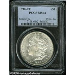 <B>1890-CC<img border='0' src='http://www.heritagecoins.com/images/star.gif' width=10 height=10>$1 MS64 PCGS.</B></I> VAM-3. Doubled Date. Fully brilliant and lustrous with frosty silver surfaces. Just a few tiny abrasions in the left obverse field keep this from the elusive Gem MS65 quality. Although the central obverse and reverse show some weakness, the overall design definition is more than adequate. Lot:10324