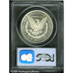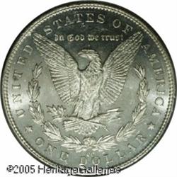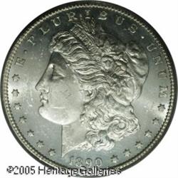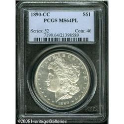 <B>1890-CC<img border='0' src='http://www.heritagecoins.com/images/star.gif' width=10 height=10>$1 MS64 Prooflike PCGS.</B></I> A light cameo effect contrasts against the obviously reflective mirrors on this lovely piece. Bright and untoned with a bold strike overall. Quite rare in finer grades, this is an important opportunity for the serious Silver Dollar collector. Lot:10329