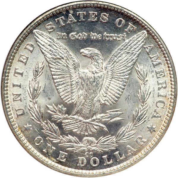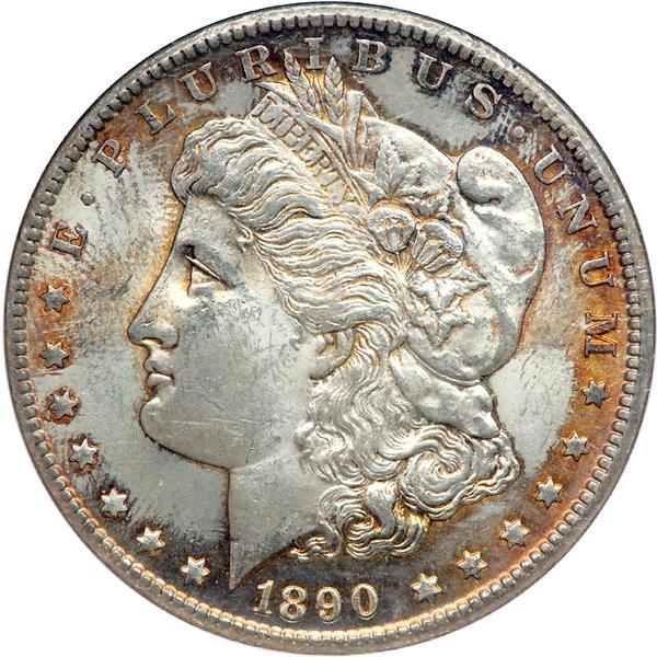 1890-CC Morgan Dollar. NGC graded MS-63. Lovely light gold toning on the obverse. Mostly frosty, with cascading luster on both sides streaming through the color (PCGS # 7198) .