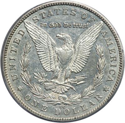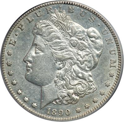1890-CC Morgan Dollar. PCGS graded AU-50. A hint of toning here and there. The surfaces are semi-reflective (PCGS # 7198) .