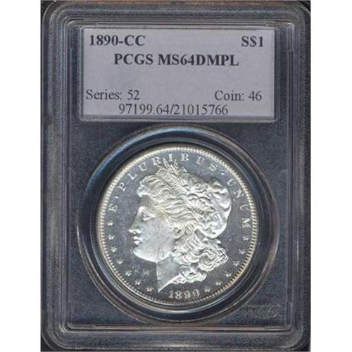 <b>1890-CC Morgan Dollar. PCGS graded MS64 DMPL.</b> Ice-cold white color streaks across the mirror-deep fields of this handsome DMPL coin. Meticulous strike on every device is what collectors look for in a '90-CC, but this coin doesn't quite make the "full" grade. Just the same, the numerical condition is exact and obviously was meticulously weighed by the grading service <b>(PCGS # 97199)</b>